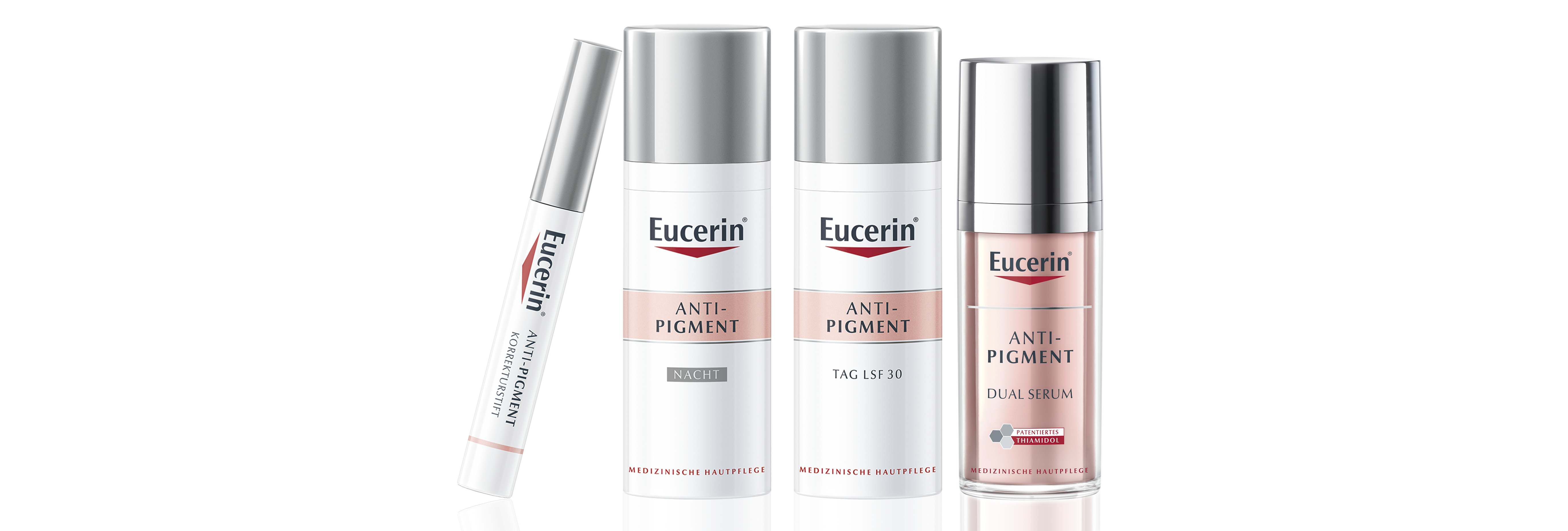 Seria stworzona przez Eucerin zawierająca opatentowany składnik Thiamidol, obejmuje krem na dzień, krem na noc, serum o podwójnym działaniu i korektor punktowy do przebarwień.