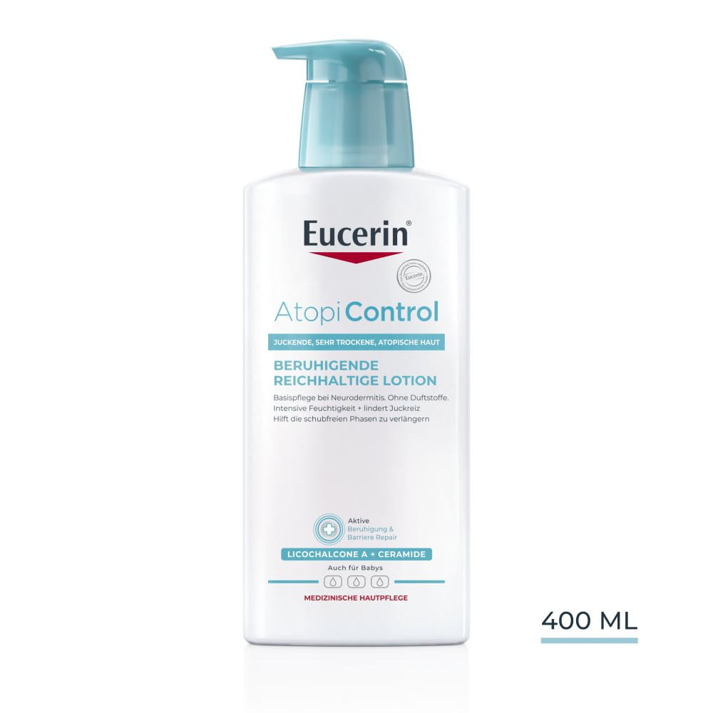 Bezzapachowy Eucerin AtopiControl Kojący Balsam Do ciała może być stosowany razem z Eucerin AtopiControl Olejek Do Mycia. Wykazano, że wspomaga sen i poprawia jakość życia osób z Atopowym Zapaleniem Skóry. Odpowiedni dla dorosłych, dzieci i niemowląt od 1. miesiąca życia.