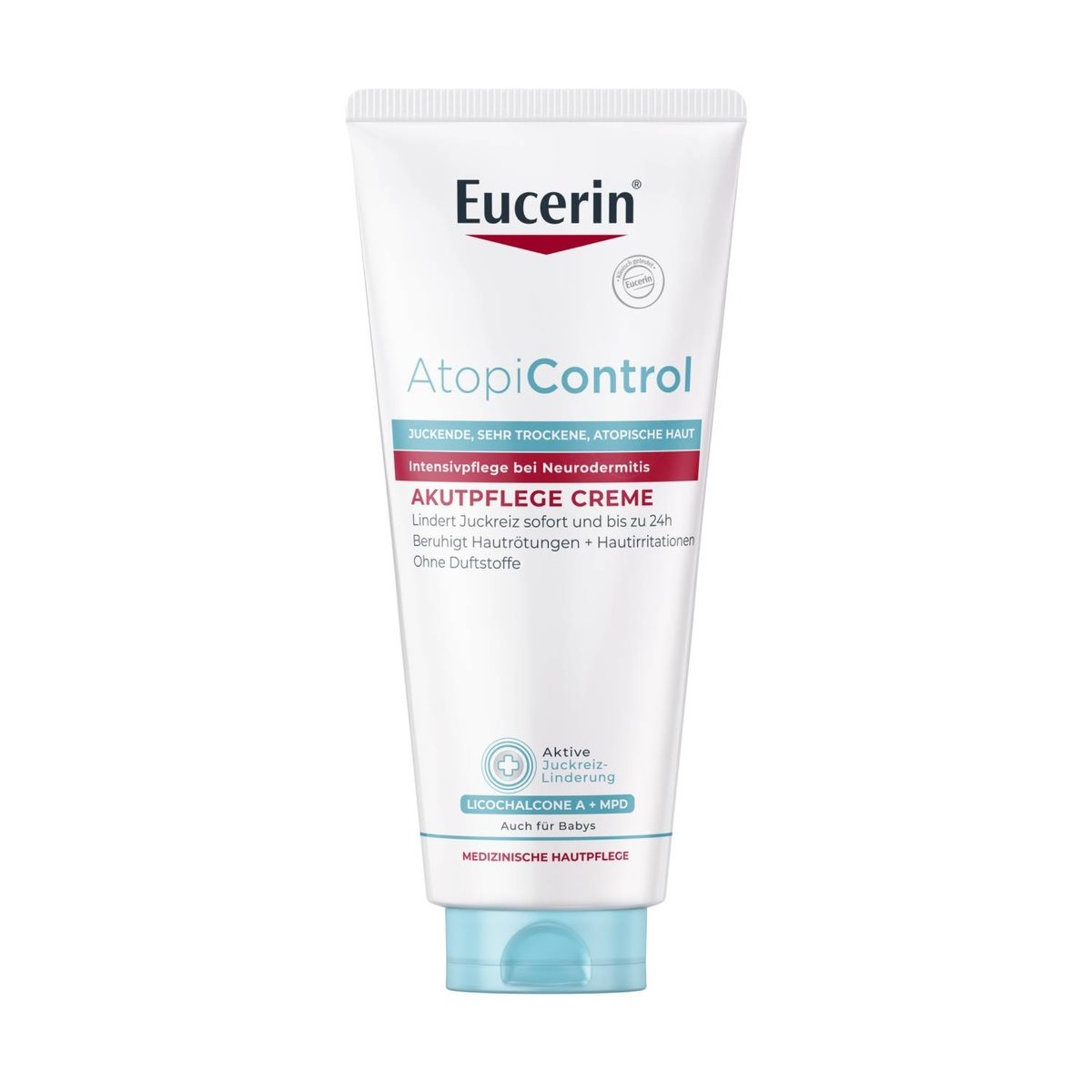 Eucerin AtopiControl Krem łagodzący w fazie zaostrzenia objawów Atopowego Zapalenia Skóry został specjalnie opracowany, aby intensywnie pielęgnować skórę i przynosić jej ulgę. Jego formuła została wzbogacona o unikalną kompozycję składników aktywnych - łagodzący Licochalcone A, antybakteryjny Decanediol oraz chłodzący i zapobiegający swędzeniu Methoxypropandiol (MPD). Ta kompozycja, wraz z wysokim stężeniem ceramidów, wzmacnia barierę ochronną skóry, redukuje suchość i przynosi ulgę w swędzeniu, co zmniejsza potrzebę drapania się.