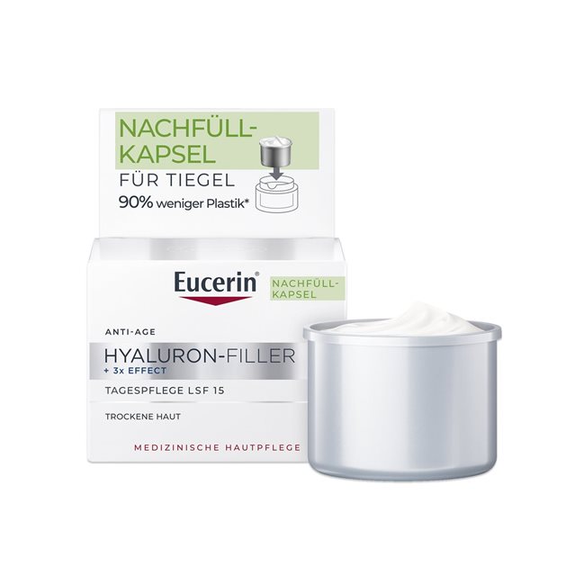 W miarę upływu czasu naturalny poziom kwasu hialuronowego w skórze spada, co prowadzi do utraty nawilżenia oraz powstawania drobnych linii i głębokich zmarszczek. Eucerin Hyaluron-Filler +3x Effect Krem na dzień SPF 15 do skóry suchej to intensywnie nawilżający krem o działaniu przeciwzmarszczkowym- widocznie wypełnia drobne linie i głębokie zmarszczki. Połączenie krótko- i długołańcuchowego Kwasu Hialuronowego działa na wielu poziomach - wygładza powierzchnię skóry, jednocześnie wnikając w jej głębsze warstwy. Dzięki filtrom SPF 15 i UVA/UVB chroni również przed przedwczesnym starzeniem się skóry spowodowanym słońcem. Dodatkowo, wkłady uzupełniające Eucerin zawierają o 90% mniej plastiku w porównaniu ze standardowym słoiczkiem kremu do twarzy Eucerin.