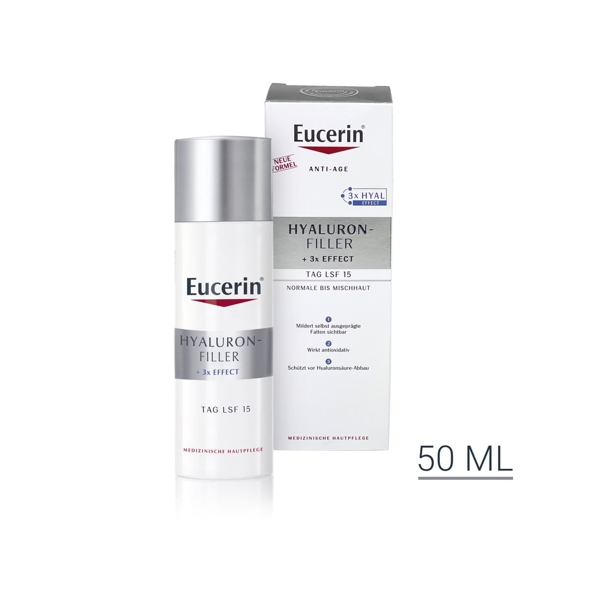 Eucerin Hyaluron-Filler Krem na dzień SPF 15 zwalcza pierwsze oznaki starzenia się skóry normalnej i mieszanej. Wyraźnie spłyca drobne linie i zmarszczki, aby skóra wyglądała młodziej, i chroni ją przed przedwczesnym starzeniem się spowodowanym promieniami UV.