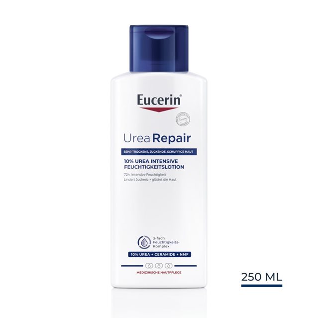 Eucerin UreaRepair PLUS balsam do ciała 10% Mocznika zawiera wysokie stężenie Mocznika oraz inne NMF (aby wiązać i magazynować wodę w skórze) oraz Ceramid (potrzebne do naprawy bariery ochronnej skóry i zmniejszenia utraty wilgoci). Formuła przynosi natychmiastową ulgę i działa dalej, opóźniając wystąpienie objawów bardzo suchej i szorstkiej skóry nawet przez 48 godzin.